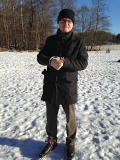 Därefter packade vi in oss i bilen och övertalade stackars pappa att följa med till Lida Friluftsgård, där vi hyrde långfärdsskridskor! Man kanske kan säga att jag hade lite väl hög tro på min färdighet inom denna sport... Jag har inte stått på skridskor på i alla fall 15 år, men trodde att jag skulle hoppa iväg och ta med mig Harry över isen... Inte riktigt i linje med verkligheten... Men jag ramlade bara två gånger! Första gången åkte hela skenan av och då var det svårt att stå upp, och andra gången körde jag ned i ett hål och vurpade! =D Den bjuder jag på och jag tyckte det var riktigt roligt! Så till nästa säsong ska vi nog införskaffa egna, så vi slipper åka ända ut till Lida för att åka... Anders åkte också, trots historier om utslagna framtänder och taskig balans. Jag tyckte han såg ut som en naturbegåvning, som vanligt...
